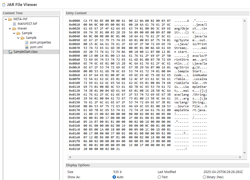 MANIFEST.MF: JAR 파일의 설명서. JAR 실행 시 어떤 클래스를 먼저 실행할지와 같은 정보 포함